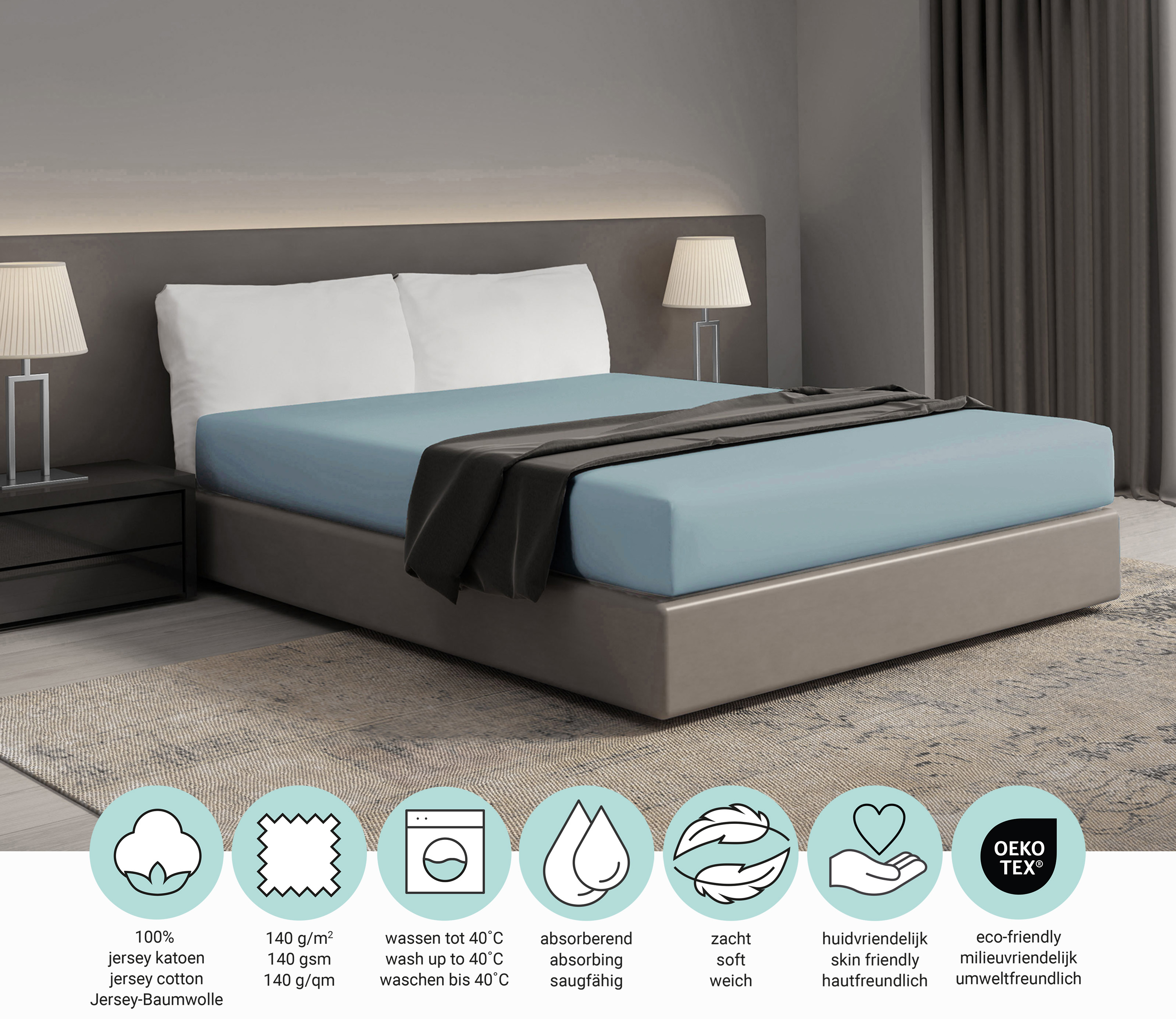 Geniet van een heerlijke nachtrust met het DoubleDry Jersey hoeslaken in een prachtige licht blauwe kleur. Dit tweepersoons hoeslaken (140×200 cm) is gemaakt van 100% zacht jersey katoen en voelt heerlijk aan op de huid. Dankzij het rondom elastiek blijft het hoeslaken perfect op zijn plaats, de hele nacht lang. Zeg maar dag tegen verschuivende hoeslakens!