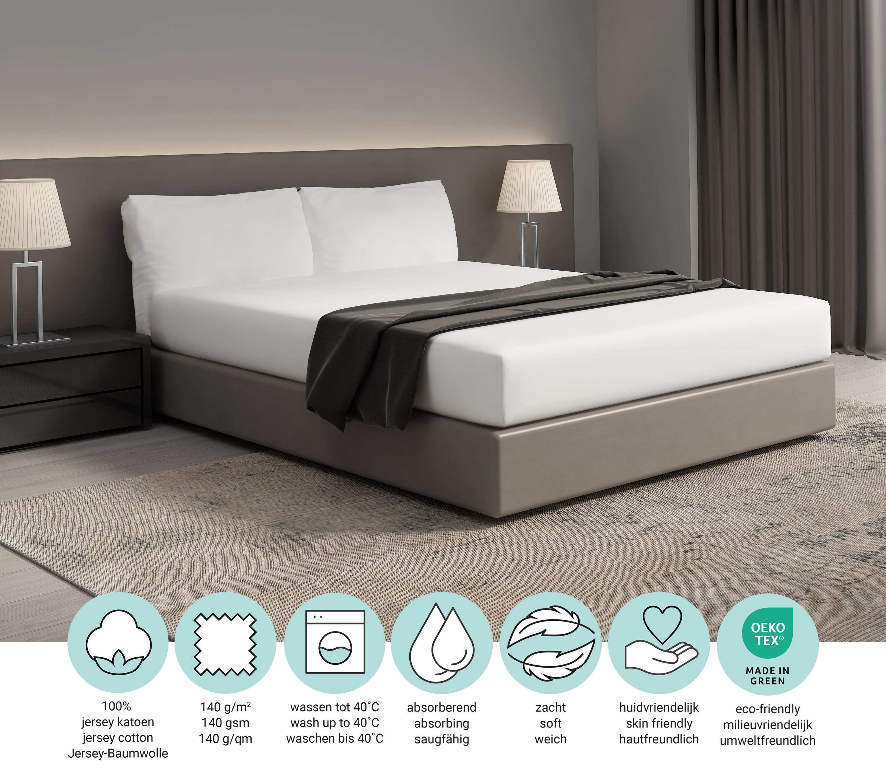 Dit jersey katoenen hoeslaken is niet alleen zacht en comfortabel, maar ook ademend en vochtregulerend, wat bijdraagt aan een optimale slaapomgeving. De draaddichtheid van 140 zorgt voor een duurzame en slijtvaste kwaliteit. Geschikt voor matrassen met een dikte tussen de 20 en 25 cm, en ideaal voor zowel thuis als in de camper of caravan. Het hoeslaken is makkelijk in onderhoud: machinewasbaar op 40°C en geschikt voor de droger op lage temperatuur.