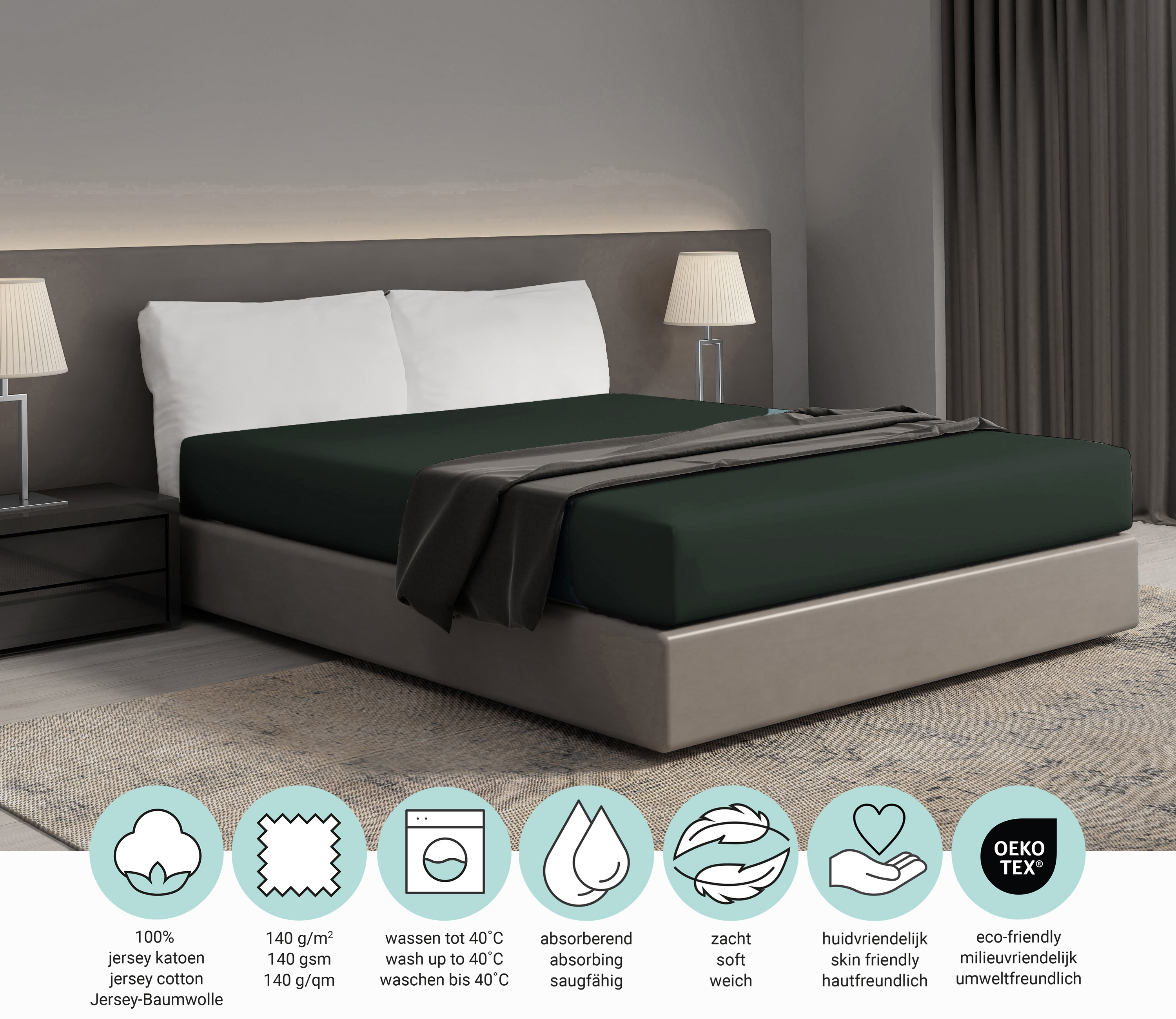 Geniet van een heerlijke nachtrust met het DoubleDry Jersey hoeslaken in een prachtige donker groene kleur. Dit tweepersoons hoeslaken (160×200 cm) is gemaakt van 100% zacht jersey katoen en voelt heerlijk aan op de huid. Dankzij het rondom elastiek blijft het hoeslaken perfect op zijn plaats, de hele nacht lang. Zeg maar dag tegen verschuivende hoeslakens!
